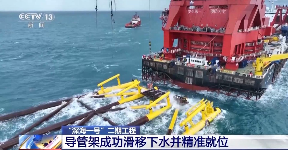 中國海油“深海一號”二期工程導管架海上安裝首席 黎世龍:“深海一號”二期工程導管架海上安裝采用滑移下水方式進行。這種方式是利用導管架自身重力並配合液壓千斤頂助推,使導管架從(cong) 駁船平穩地滑入海中,再通過起重船將導管架吊裝扶正坐底,從(cong) 而實現安裝就位。