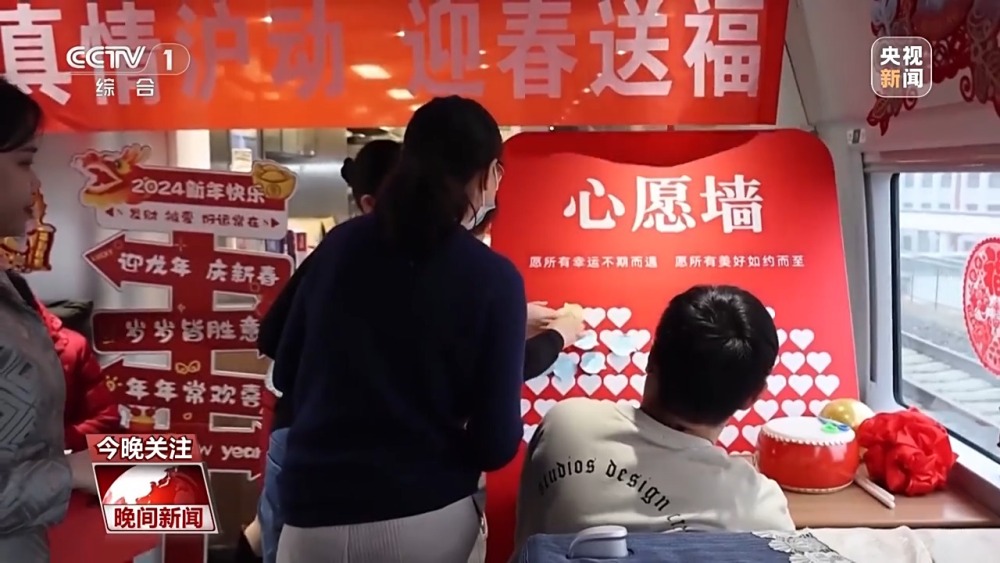 同樣,在青島開往上海虹橋的G232次列車上,列車工作人員寫(xie) 福字寫(xie) 春聯,提前為(wei) 旅客送上新春祝福。工作人員還為(wei) 每一名參加活動的旅客,準備了愛心形狀的便利貼,寫(xie) 下新年心願。