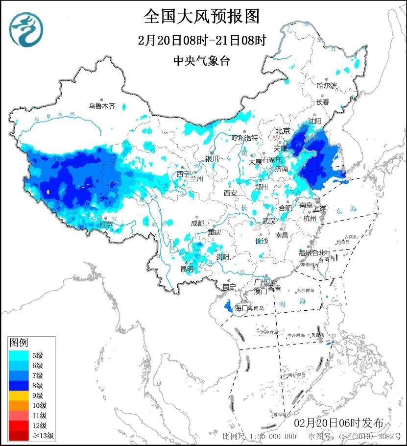 2月21日8時至22日8時,西藏中西部、青海中南部、華北東(dong) 部、黃淮西部和東(dong) 部、江淮西部等地的部分地區有5至6級風,陣風7至8級。渤海、渤海海峽、黃海大部海域將有7至8級,陣風9至10級的大風。