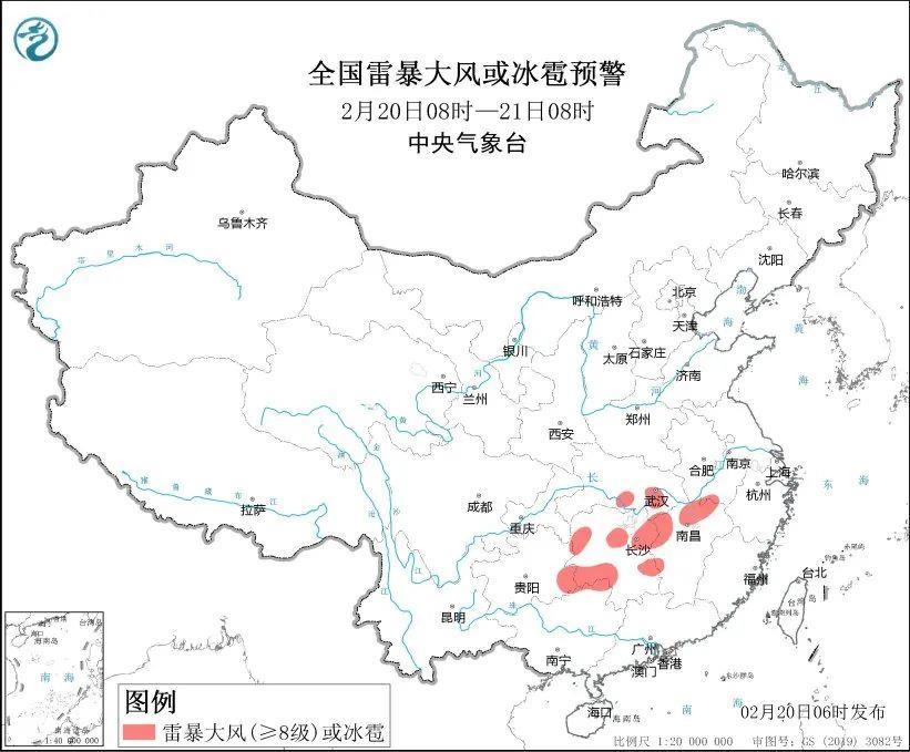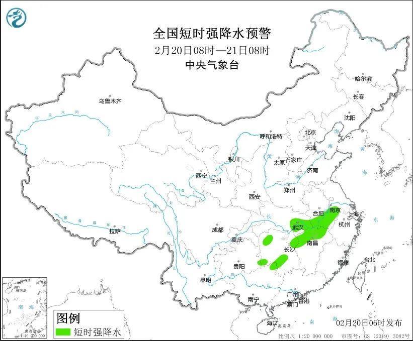 預計2月20日8時至21日8時,安徽西南部、湖北東(dong) 部和南部、湖南中北部和西南部、江西中北部、貴州東(dong) 南部、廣西東(dong) 北部等地的局地將有8至10級雷暴大風或冰雹天氣;安徽中南部、江蘇西南部、湖北東(dong) 部、湖南南部和西部、江西北部、廣西東(dong) 北部等地的部分地區將有短時強降水天氣,最大小時雨量20至30毫米,局地可達35毫米以上。
