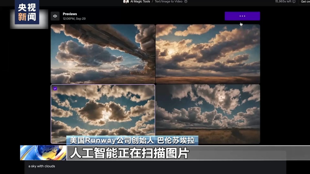 美國Runway公司創始人 巴倫(lun) 蘇埃拉:讓我們(men) 做一個(ge) 有雲(yun) 的天空,我可以選擇電影風格或預覽角度。我真的很喜歡這張,它看起來就像光是從(cong) 雲(yun) 裏出來的。人工智能正在掃描圖片,並由此生成一段視頻。你現在可以看到雲(yun) 正在移動,天空正在變暗,暴風雨就要來了。