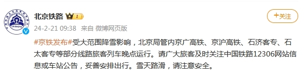 北京鐵路:受降雪影響 京廣高鐵等部分線路列車晚點