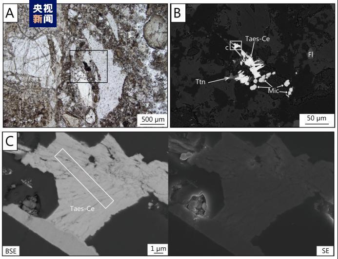 △ 鈰鉭易解石產(chan) 出狀態及其共生礦物組合