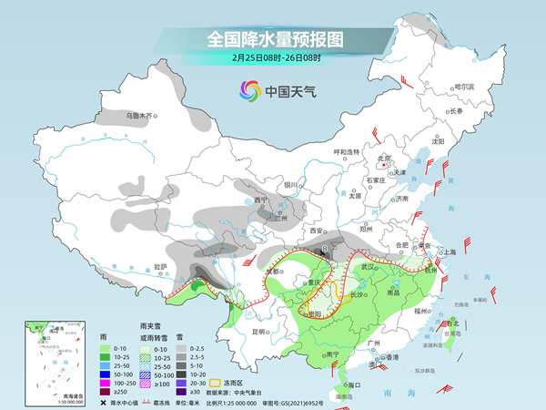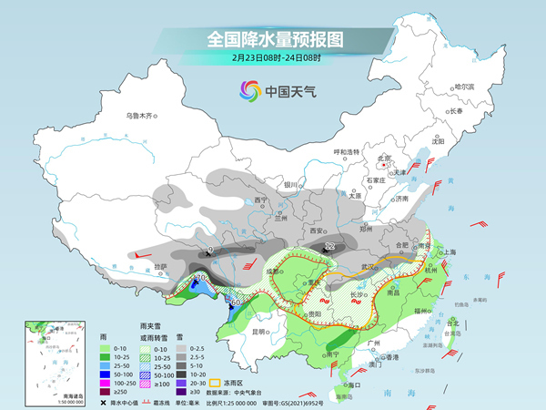 今天(2月23日),我國中東(dong) 部等地大範圍雨雪持續,降水強度繼續減弱,不過陝西南部、湖北東(dong) 部和南部等地部分地區仍有大雪,局地暴雪,湖南、貴州等地有凍雨。明後天,北方大部降雪停歇,南方仍有雨雪天氣。預計南方多陰雨的天氣格局將延續至月底,大部地區氣溫也持續低迷,公眾(zhong) 春運出行需注意防範。