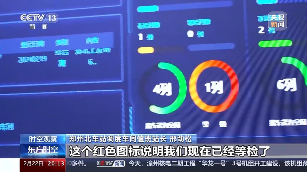 鄭州北車站調度車間值班站長 邢勁鬆:三種圖標,你看黃色圖標說明我們(men) 檢車能力不太緊張,然後綠色圖標說明我們(men) 接車能力空閑,紅色圖標說明我們(men) 現在已經等檢了。今天我們(men) 白班基本上開了三列化肥煤車,通過大數據服務我們(men) 的春耕生產(chan) 。