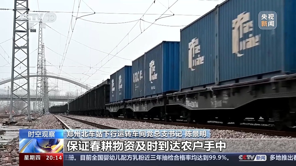 總台央視記者 蔣樹林:這裏是鄭州北車站,也是全國作業(ye) 量最大的編組站,大家看我眼前這個(ge) 車裏麵裝的就是當下春耕所急需用的化肥原料,作業(ye) 還在加班加點地往前推進。