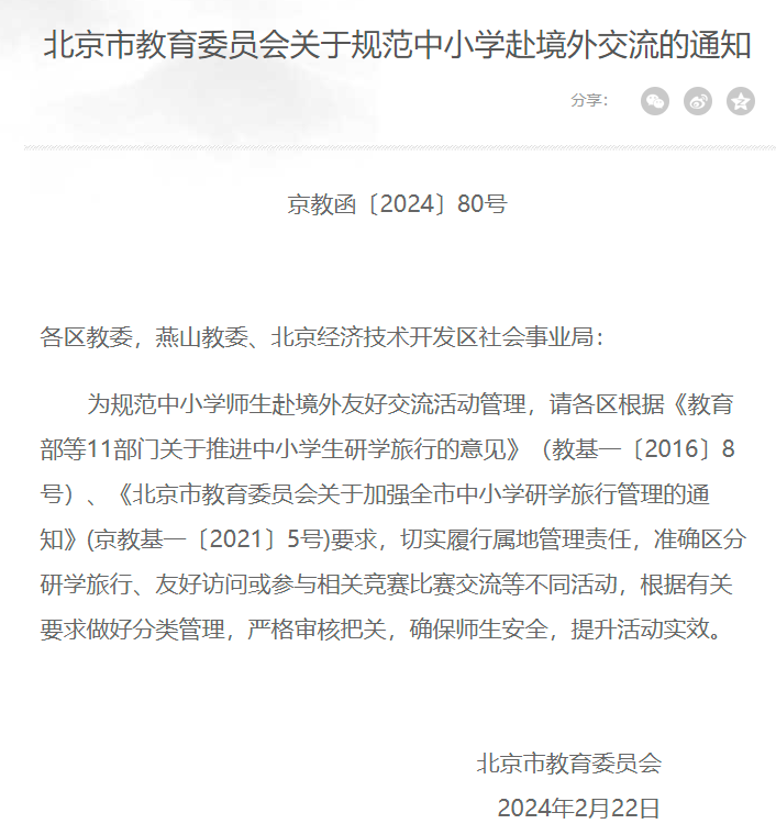 央廣網北京3月11日消息(記者馮(feng) 儀(yi) )近日,北京市教委發布關(guan) 於(yu) 規範中小學赴境外交流的通知,通知中提到,請各區根據《教育部等11部門關(guan) 於(yu) 推進中小學生研學旅行的意見》(教基一〔2016〕8號)、《北京市教育委員會(hui) 關(guan) 於(yu) 加強全市中小學研學旅行管理的通知》(京教基一〔2021〕5號)要求,切實履行屬地管理責任,準確區分研學旅行、友好訪問或參與(yu) 相關(guan) 競賽比賽交流等不同活動,根據有關(guan) 要求做好分類管理,嚴(yan) 格審核把關(guan) ,確保師生安全,提升活動實效。