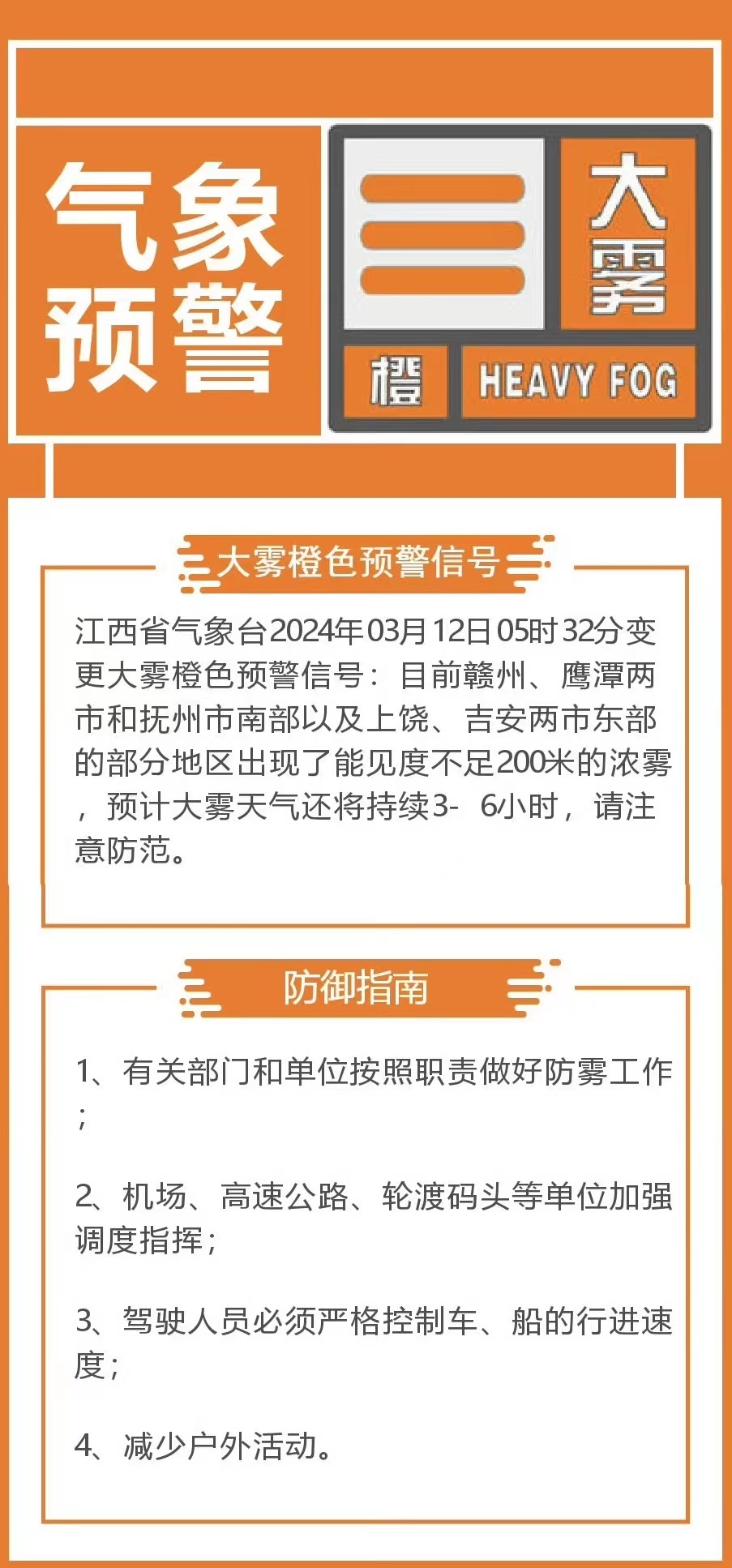 江西省氣象台2024年3月12日5時32分變更大霧橙色預警信號:目前贛州、鷹潭兩(liang) 市和撫州市南部以及上饒、吉安兩(liang) 市東(dong) 部的部分地區出現了能見度不足200米的濃霧,預計大霧天氣還將持續3~6小時,請注意防範。