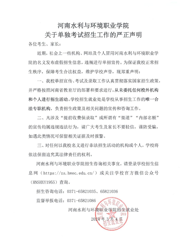 央廣網北京3月12日消息(記者 馮(feng) 儀(yi) ) 據中國互聯網聯合辟謠平台消息,隨著河南高職單招誌願填報時間臨(lin) 近,一些涉單獨考試招生工作的流言和誤區在網上流傳(chuan) 。為(wei) 此,河南水利與(yu) 環境職業(ye) 學院、鄭州電力高等專(zhuan) 科學校、三門峽職業(ye) 技術學院等10餘(yu) 所河南所屬高校就單獨考試招生工作發布嚴(yan) 正聲明,凡涉及“提前收費保錄取”或所謂有“渠道”“內(nei) 部名額”的宣傳(chuan) 均屬違規違法行為(wei) ,請廣大考生及家長不要輕信,謹防受騙,如遇此類情況可保留相關(guan) 證據及時報警。