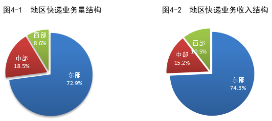 1-2月,東(dong) 、中、西部地區快遞業(ye) 務量比重分別為(wei) 72.9%、18.5%和8.6%,業(ye) 務收入比重分別為(wei) 74.3%、15.2%和10.5%。與(yu) 去年同期相比,東(dong) 部地區快遞業(ye) 務量比重下降2.2個(ge) 百分點,快遞業(ye) 務收入比重下降1.2個(ge) 百分點;中部地區快遞業(ye) 務量比重上升1.5個(ge) 百分點,快遞業(ye) 務收入比重上升0.7個(ge) 百分點;西部地區快遞業(ye) 務量比重上升0.7個(ge) 百分點,快遞業(ye) 務收入比重上升0.5個(ge) 百分點。