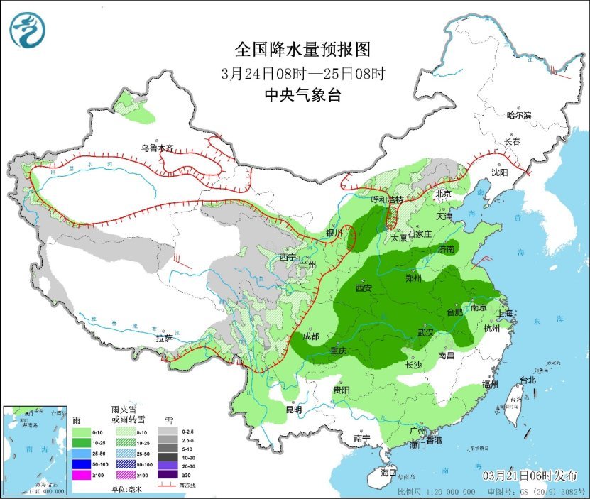 受冷空氣影響,22日夜間至25日,中東(dong) 部大部地區自北向南將出現4~6℃降溫,部分地區降溫8~10℃,長江中下遊及其以北地區將有4~5級偏北風,陣風可達6~8級,內(nei) 蒙古中東(dong) 部及東(dong) 北地區西部等地局地有揚沙或浮塵;受冷暖空氣共同影響,西北地區東(dong) 部、黃淮、江淮、江漢、江南中北部、四川東(dong) 北部、重慶及貴州東(dong) 部等地的部分地區有中到大雨,局地暴雨或大暴雨,上述地區局地伴有短時強降水、風雹等強對流天氣。