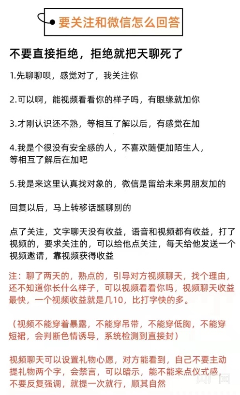 記者注意到,“使用手冊(ce) ”第一頁聲明中稱,隻參與(yu) 軟件推廣,不涉及套路教學、虛假聊天、誘導充值。當記者對是否能賺到錢表示擔憂時,該推廣員發來一份“社交聊天日入千元攻略”,包含怎樣設置頭像、如何引導對方視頻聊天、如何拒加微信等信息。