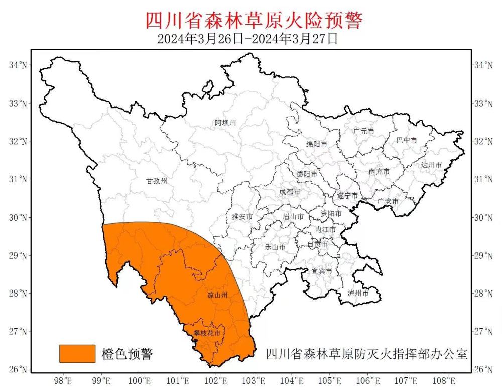 經四川省森防指辦公室與(yu) 四川省林草局、四川氣象局及相關(guan) 地區會(hui) 商,預計3月26日至27日攀枝花市,甘孜州東(dong) 部局地和南部,涼山州西部、中部和南部(涉及21個(ge) 縣級行政單位)森林草原火險等級將維持在高度危險級別。經研究,延長省森防指辦公室3月21日發布的高森林草原火險橙色預警至3月27日,預警範圍不變。