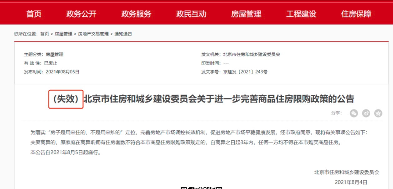 2021年8月4日,北京市住建委發文規定,夫妻離異的,原家庭在離異前擁有住房套數不符合本市商品住房限購政策規定的,自離異之日起3年內(nei) ,任何一方均不得在本市購買(mai) 商品住房。
