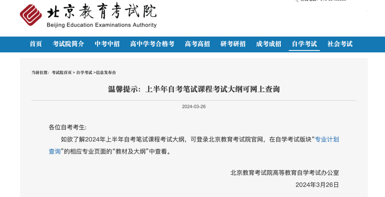 央廣網北京3月27日消息(記者 吳佳怡)據悉,2024年上半年自考筆試課程考試大綱可網上查詢。考生可登錄北京教育考試院官網,在自學考試版塊“專(zhuan) 業(ye) 計劃查詢”的相應專(zhuan) 業(ye) 頁麵的“教材及大綱”中查看。