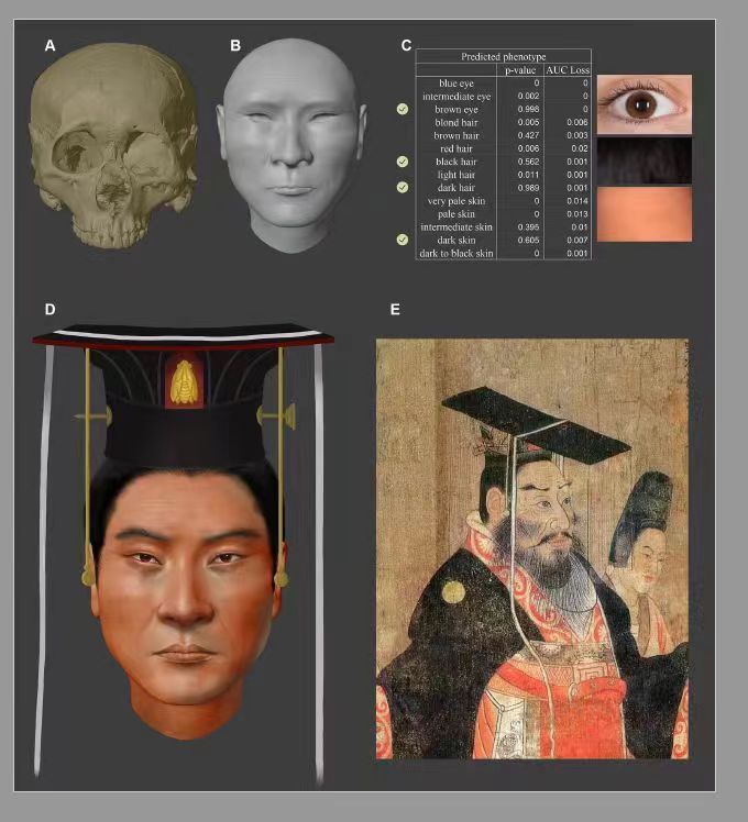 複旦大學科技考古研究院文少卿團隊用專(zhuan) 門適用於(yu) 古DNA的捕獲探針,從(cong) 北周武帝肢骨樣本上獲取了約100萬(wan) 個(ge) 可用的基因位點,還原北周武帝頭發、皮膚、瞳孔等關(guan) 鍵特征。經過6年的反複嚐試,終於(yu) “描繪”出宇文邕頭像。