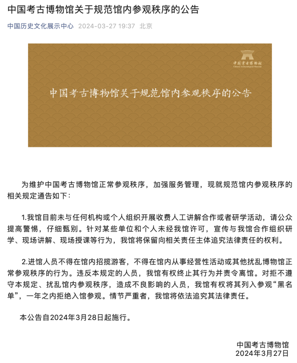 3月27日,中國考古博物館發布關(guan) 於(yu) 規範館內(nei) 參觀秩序的公告。