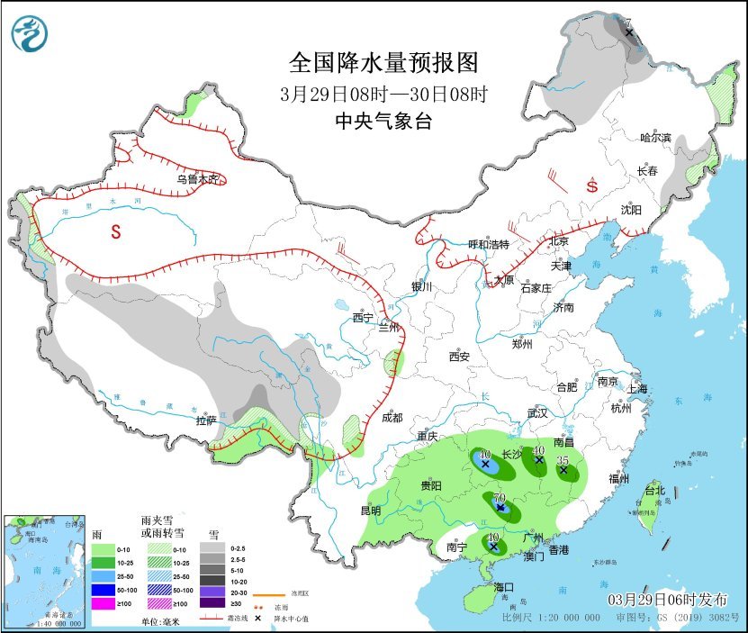 3月29日8時至30日8時,內(nei) 蒙古東(dong) 北部、黑龍江西北部和東(dong) 部、吉林東(dong) 部、西藏東(dong) 部、青海西部等地部分地區有小到中雪或雨夾雪,其中,黑龍江西北部部分地區有大雪(5~7毫米)。湖南西部和東(dong) 部、江西中南部、廣西東(dong) 部、廣東(dong) 中西部等地部分地區有中到大雨,其中,廣西東(dong) 北部部分地區有暴雨(50~70毫米)。內(nei) 蒙古東(dong) 南部和西北部、河北北部等地部分地區有4~6級風。