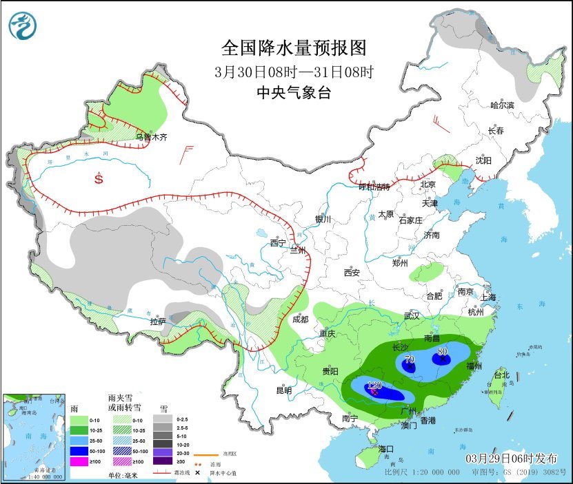 3月30日8時至31日8時,黑龍江北部、新疆南疆高海拔山區、西藏大部、青海西部、川西高原南部等地部分地區有小到中雪或雨夾雪。湖南中南部、江南中南部、福建大部、廣西西北部、廣東(dong) 大部等地部分地區有中到大雨,其中,湖南東(dong) 南部、江西西南部和東(dong) 部、福建西部、廣西東(dong) 北部、廣東(dong) 西部等地部分地區有暴雨或大暴雨(100~120毫米)。內(nei) 蒙古東(dong) 南部、新疆東(dong) 部等地部分地區有4~5級風。