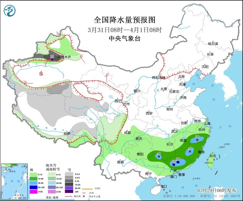3月31日8時至4月1日8時,新疆沿天山高海拔地區、西藏中北部、青海西部、川西高原等地部分地區有小到中雪或雨夾雪,其中,新疆沿天山地區和伊犁河穀等地部分地區有大到暴雪,局地大暴雪(20~25毫米)。浙江南部、江西東(dong) 部和南部、湖南南部、貴州東(dong) 南部、廣西東(dong) 北部、廣東(dong) 中北部、福建等地部分地區有中到大雨,其中,廣東(dong) 北部等地部分地區有暴雨(50~80毫米)。新疆南疆盆地和東(dong) 部、甘肅河西等地部分地區有4~6級風。