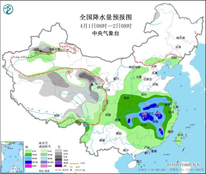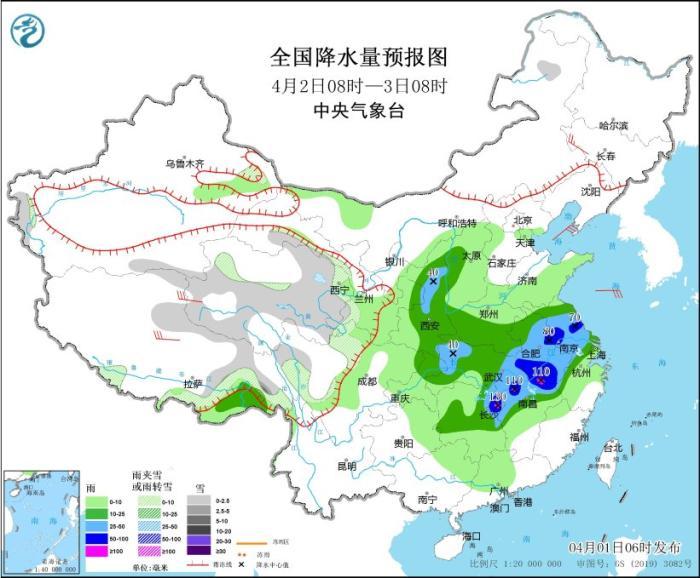 4月1日08時至2日08時,新疆沿天山地區和南疆盆地、西藏北部和東(dong) 部、青海大部、川西高原北部等地部分地區有小到中雪或雨夾雪,其中,新疆沿天山地區和南疆盆地、青海東(dong) 北部等地部分地區有大到暴雪,新疆沿天山地區局地大暴雪(20~21毫米)。陝西東(dong) 南部、河南中南部、安徽大部、江蘇中西部、四川東(dong) 部、重慶大部、貴州東(dong) 北部、湖北、湖南中北部、江西大部、浙江中西部、福建中西部等地部分地區有中到大雨,其中,河南南部、安徽中南部、湖北東(dong) 部和南部、湖南北部和西部、江西北部和東(dong) 南部、福建西部、重慶東(dong) 南部等地部分地區有暴雨,局地大暴雨(100~120毫米)。內(nei) 蒙古西北部、新疆東(dong) 部、青海西部、甘肅河西等地部分地區有4~6級風,其中,新疆東(dong) 部部分地區有7~8級風,山口風力可達11級以上。