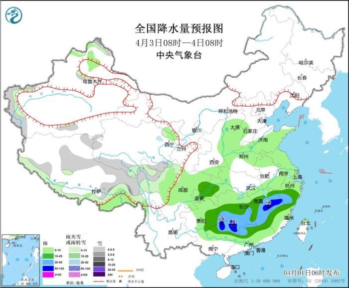 4月3日08時至4日08時,新疆北疆高海拔地區和南疆西部山區、西藏北部、東(dong) 部和西南部、青海南部、川西高原北部等地部分地區有小到中雪或雨夾雪。四川東(dong) 部、重慶中部、貴州東(dong) 部、浙江中南部、江西大部、湖南中南部、廣西北部、廣東(dong) 北部等地部分地區有中到大雨,其中,湖南南部、江西中北部、福建西北部、廣西東(dong) 北部等地部分地區有暴雨,局地大暴雨(100~110毫米)。