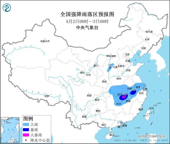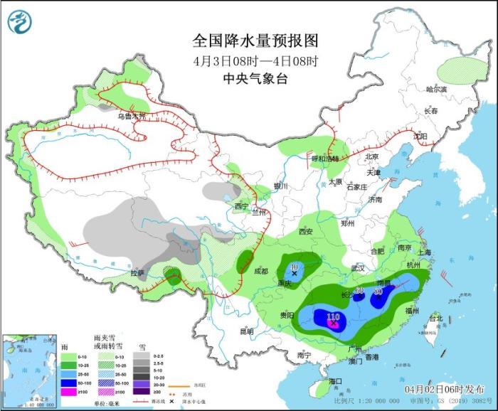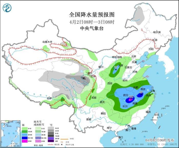 4月2日08時至3日08時,內(nei) 蒙古東(dong) 北部、西藏東(dong) 部、甘肅河西、青海中南部、川西高原北部等地部分地區有小雪或雨夾雪,其中,西藏東(dong) 南部、青海東(dong) 南部、甘肅西南部等地部分地區有中到大雪(5~8毫米)。陝西東(dong) 部、山西西部、黃淮南部、江淮大部、江漢、江南北部、四川盆地東(dong) 部、重慶東(dong) 北部等地部分地區有中到大雨,其中,湖北東(dong) 南部、湖南東(dong) 北部、安徽東(dong) 南部、江西東(dong) 北部等地部分地區有暴雨,局地大暴雨(100~150毫米)。內(nei) 蒙古東(dong) 北部部分地區有4~5級風。