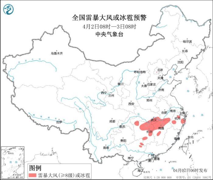 全國雷暴大風或冰雹預警(4月2日08時-3日08時)