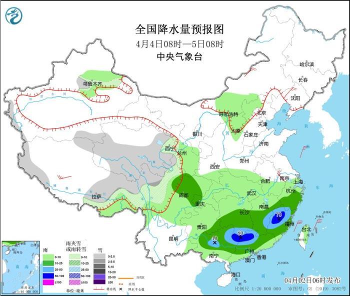 4月4日08時至5日08時,新疆沿天山地區、西藏南部和東(dong) 部、青海中南部、甘肅河西、川西高原北部等地部分地區有小到中雪或雨夾雪。四川盆地大部、重慶西南部、貴州東(dong) 南部、江南中南部、華南中北部等地部分地區有中到大雨,其中,福建西北部、廣西東(dong) 北部、廣東(dong) 西北部等地部分地區有暴雨(50~80毫米)。內(nei) 蒙古中部、遼寧北部、西藏南部等地部分地區有4~5級風。