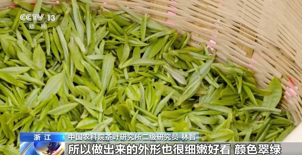 中國農(nong) 科院茶葉研究所二級研究員 林智:所以它有幾個(ge) 特點,第一個(ge) 就是好看,為(wei) 什麽(me) 說好看呢,因為(wei) 春天茶的芽葉比較細嫩,所以也比較金貴,做工一般都比較講究,做出來的外形也很細嫩好看,顏色翠綠。