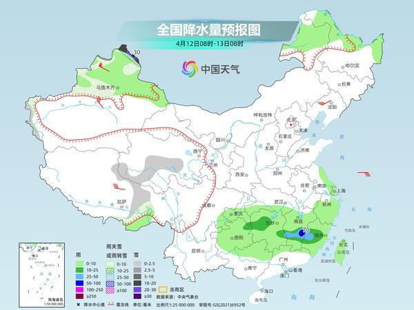 後天,新疆北疆北部和沿天山地區、西藏東(dong) 部、青海南部等地部分地區有小到中雪或雨夾雪,其中,新疆北疆北部的部分地區有大到暴雪,局地大暴雪(20~30毫米)。貴州西北部、湖南中部、江西中部、福建中部等地部分地區有中到大雨,其中,江西東(dong) 部的部分地區有暴雨。