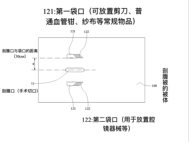 “大家都知道電工,他們(men) 在爬高下低的時候,都是把工具插在腰包上。我的設計靈感就來源此。”劉騰飛說,“手術剖腹被”就是要解決(jue) 手術醫生在手術過程中需要更換器械時的不方便。該手術剖腹被的被體(ti) 側(ce) 邊設置有器械袋,器械袋包括第一袋口和若幹個(ge) 第二袋口;第一袋口為(wei) 上方開口,下方閉口的袋體(ti) ;第二袋口斜向條狀設置,並上下開口。第一袋口用於(yu) 放置如剪刀等小的手術器械,第二袋口用於(yu) 放置長條形的腔鏡微創手術專(zhuan) 用器械,便於(yu) 手術醫生在手術過程中更換器械。