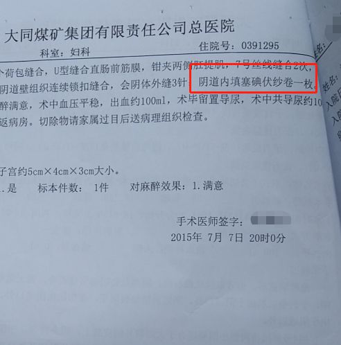 2015年7月,譚先生的母親(qin) 曾在同煤集團總醫院婦科做手術。他提供的一份落款日期為(wei) 2015年7月7日的手術記錄顯示,其母在大同市煤礦集團有限責任公司總醫院婦科做了“下行陰式子宮切除術+陰道前後壁修補術+尿道折疊術+盆腔粘連鬆解術”,縫合之後在“陰道內(nei) 填塞碘伏卷紗一枚”。