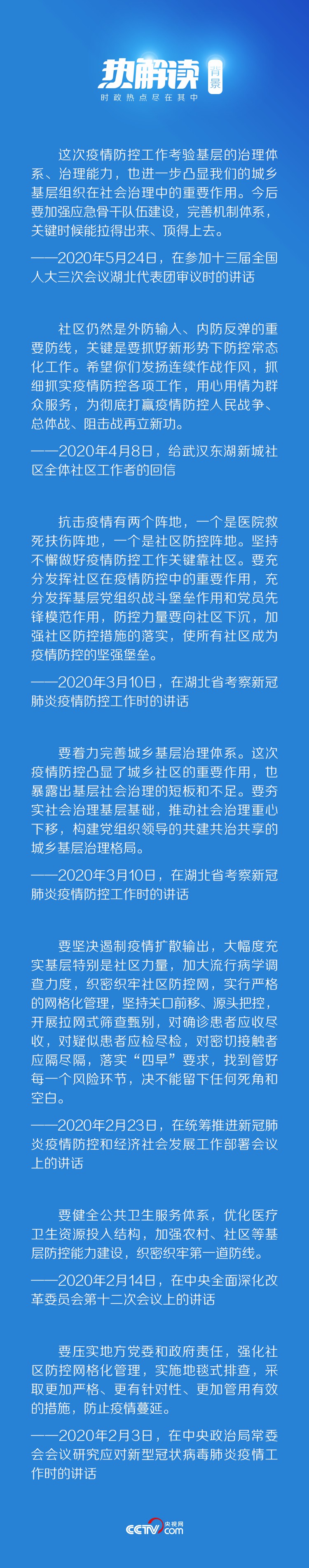 在湖北團,習(xi) 近平認真聽取大家發言後說:“這一次疫情,考驗我們(men) 基層的治理體(ti) 係、治理能力水平。進一步凸顯我們(men) 的街道、社區、鄉(xiang) 鎮、村基層組織的作用。疫情防控主要靠兩(liang) 個(ge) ,一個(ge) 就是一線救治,醫護人員的作用;一個(ge) 就是封控,社區、鄉(xiang) 村這個(ge) 作用,都發揮得很好。看看我們(men) 在基層治理方麵有哪些成績可以總結,鞏固提高,還有哪些不足需要完善。”