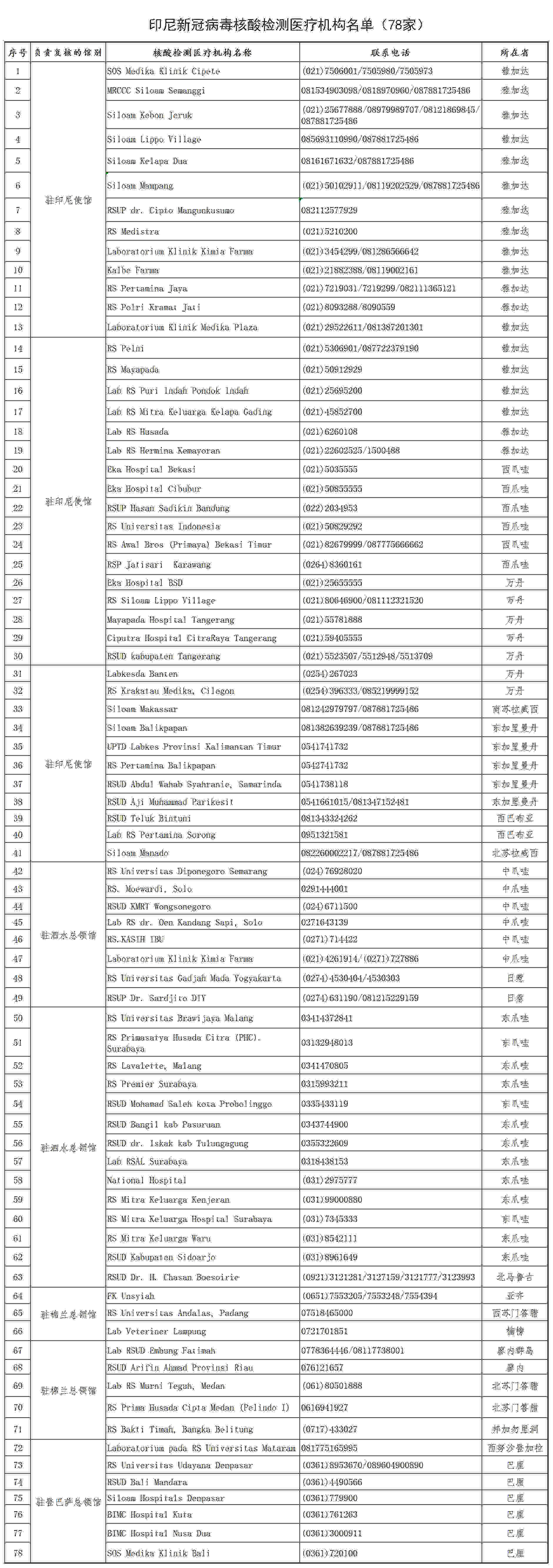 經與(yu) 印尼衛生部及相關(guan) 醫療機構聯係確認,現將中國駐印尼使領館認可的具有新冠病毒核酸檢測資質的醫療機構名單予以公布,供大家參考。該名單將動態調整,請密切關(guan) 注。