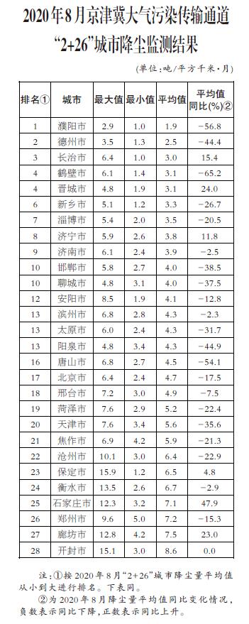 生態環境部公布8月京津冀大氣汙染傳輸通道 “2+26”城市和汾渭平原11城市降塵監測結果