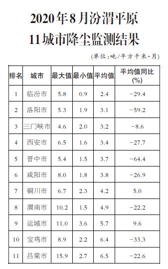 8月,汾渭平原11個(ge) 城市降塵量均值範圍在2.4-6.5 噸/平方千米·月之間,平均為(wei) 4.3噸/平方千米·月,同比下降30.6%。汾渭平原11個(ge) 城市降塵量平均值均小於(yu) 9.0噸/平方千米·月。渭南、運城、呂梁等3個(ge) 城市降塵量最大值大於(yu) 9.0噸/平方千米·月;銅川、運城等兩(liang) 個(ge) 城市降塵量平均值同比不降反升。