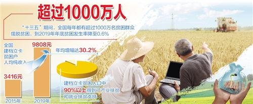 “十三五”期間,全國每年都有超過1000萬(wan) 名貧困群眾(zhong) 擺脫貧困,脫貧進度符合預期。到2019年年底,貧困發生率降至0.6%。目前,國家正對52個(ge) 未摘帽貧困縣和1113個(ge) 貧困村實施掛牌督戰,凝心聚力堅決(jue) 啃下最後的硬骨頭。