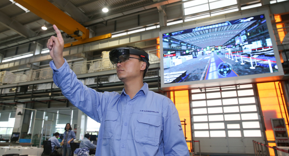 中國商飛公司總裝製造中心智慧數控車間主要承擔飛機零部件的研製、生產(chan) 工作,其產(chan) 品用於(yu) C919大型客機、ARJ21新支線客機。圖為(wei) 工作人員在中國商飛公司總裝製造中心智慧數控車間使用AR眼鏡操控虛擬電子屏幕。新華社記者 丁汀 攝