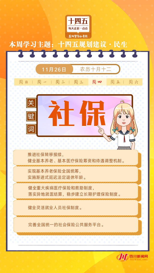 本周學習(xi) 主題“十四五規劃建議·民生”係列,一張張學習(xi) 卡帶你了解就業(ye) 、收入、住房……那些與(yu) 你息息相關(guan) 的民生舉(ju) 措!今天打卡學習(xi) “十四五”規劃建議中有關(guan) 社保的舉(ju) 措。