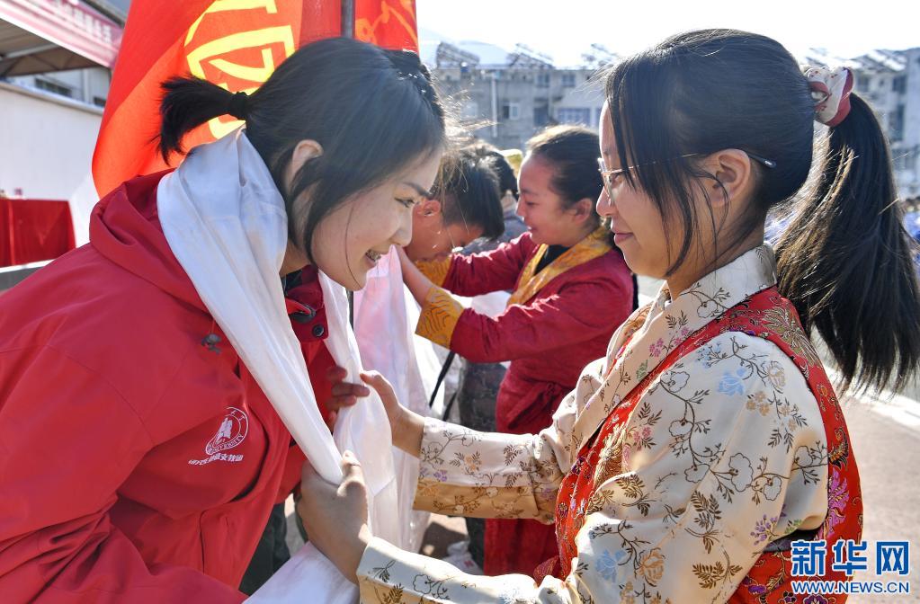 山南市東(dong) 輝中學學生代表向湖北大學碩士研究生支教團成員獻哈達(3月29日攝)。新華社記者 張汝鋒 攝