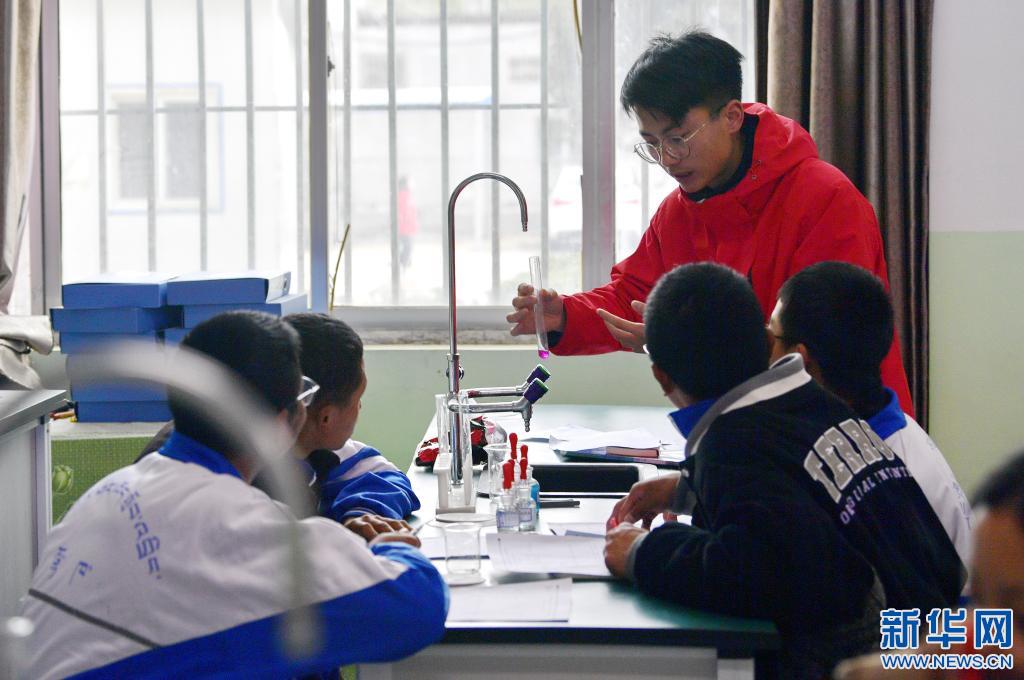 在山南市東(dong) 輝中學實驗室,來自湖北大學化學化工學院的碩士研究生劉思江指導學生做化學實驗(3月29日攝)。新華社記者 張汝鋒 攝