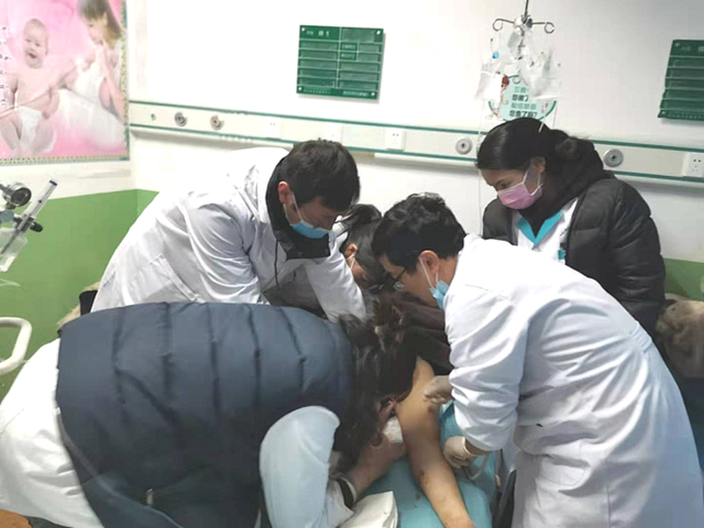 臍帶脫垂是威脅胎兒(er) 生命的嚴(yan) 重並發症,可謂產(chan) 科急症中的急症。“孕婦頭低臀高,馬上準備剖宮產(chan) 。”孫豐(feng) 濤顧不得高原反應的不適,一邊小跑,一邊做著急救安排。醫療隊隊長徐鴻宇、隊員李捷、徐兵分頭行動,展開術前準備。