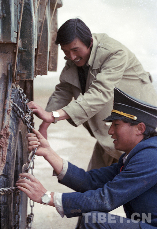 這是郵政人員正在為(wei) 郵車的輪胎綁防滑鏈條,以便郵車順利通過泥濘路。上世紀七八十年代,由於(yu) 藏北西部交通不便,每半月通郵一次的郵車常常會(hui) 在草原上遭遇陷車等困難(唐召明1987年攝)