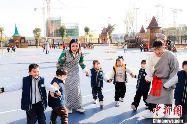 12月1日,在黃石大冶市尹家湖幼兒(er) 園就業(ye) 的西藏教師赤列旦增和拉珍在教小朋友跳民族舞。何戈 攝