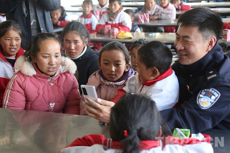 圖為(wei) 拉薩邊檢站民警和孩子們(men) 一起和東(dong) 莞邊檢站民警視頻通話 攝影:王佳豪