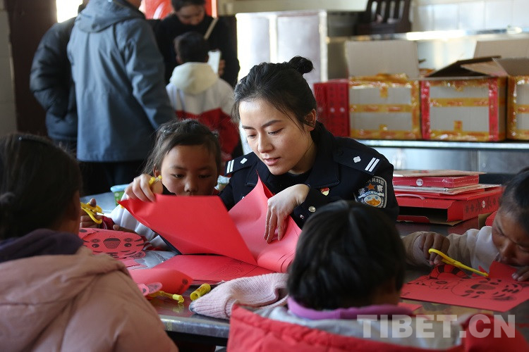 圖為(wei) 拉薩邊檢站民警和孩子們(men) 共同完成手工剪紙 攝影:王佳豪