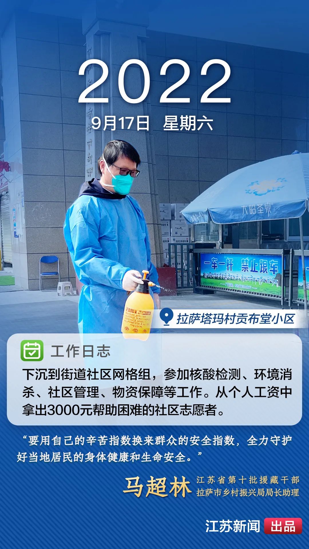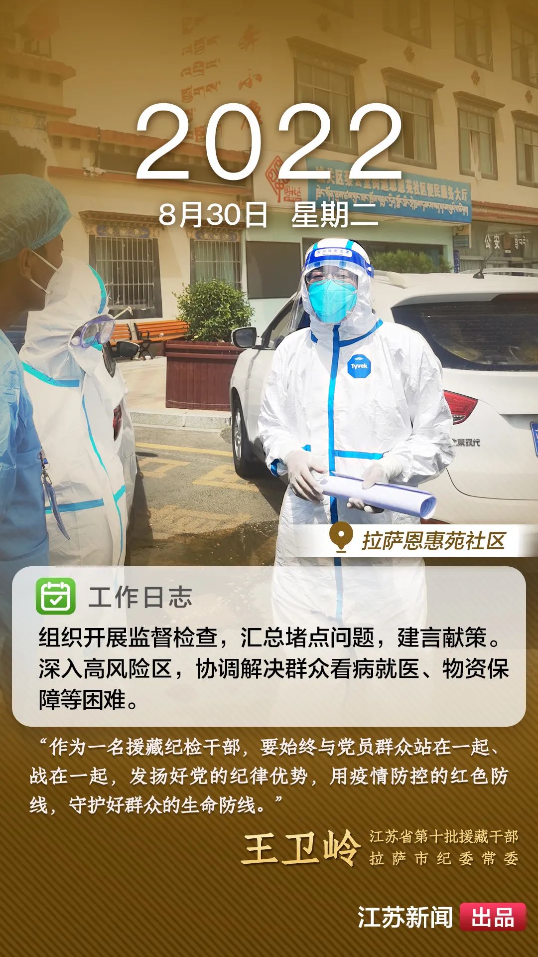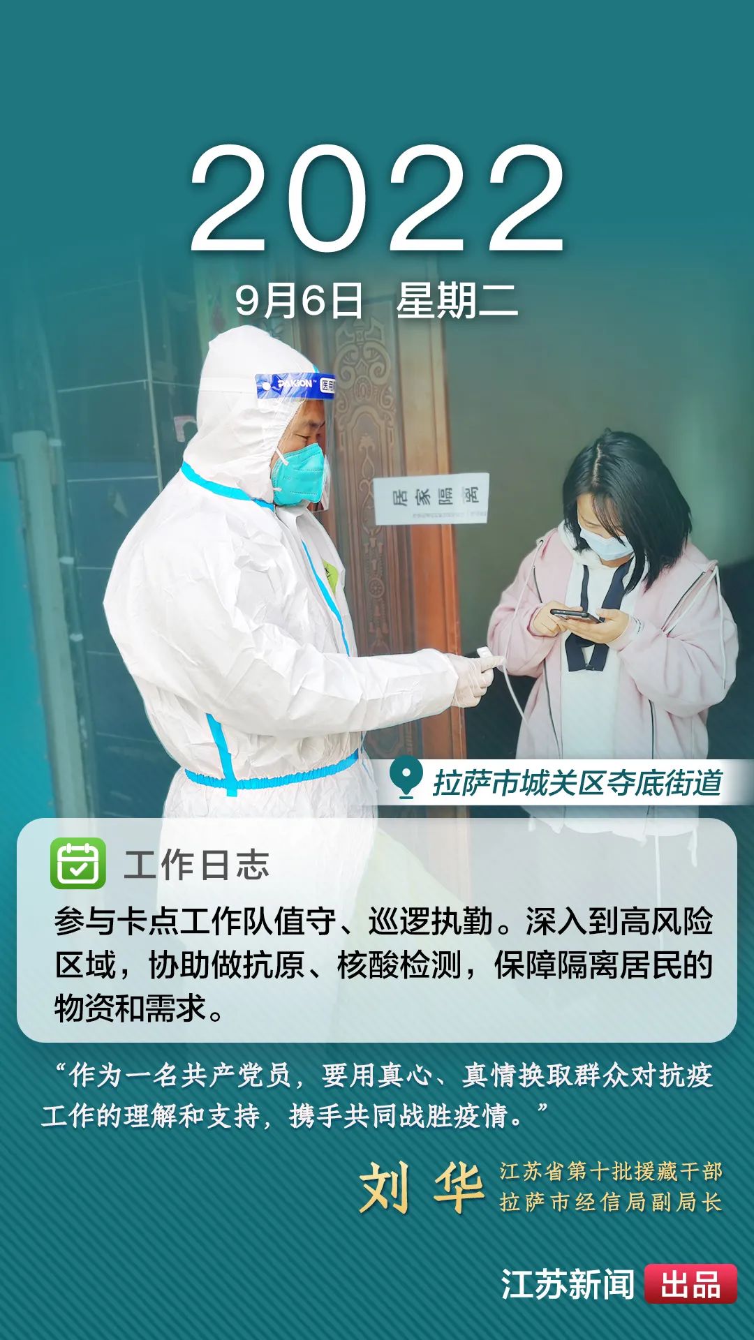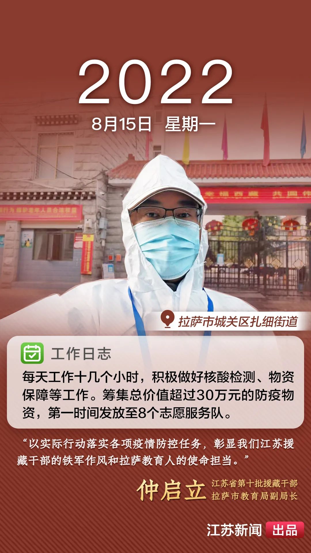 2022年8月,一場突如其來的新冠肺炎疫情襲擊拉薩。江蘇援藏前方指揮部樹立高度的政治意識,堅決(jue) 貫徹江蘇省委、省政府主要領導批示精神和自治區、拉薩市部署要求,全力以赴做好疫情防控工作。第十批援藏幹部人才克服初到高原的身體(ti) 反應,服從(cong) 服務大局、勇於(yu) 擔當作為(wei) ,迅速投身疫情防控工作一線,以實際行動展現江蘇援藏的鐵軍(jun) 作風。近期,我們(men) 將陸續推出江蘇援藏幹部人才抗疫身影,敬請關(guan) 注。