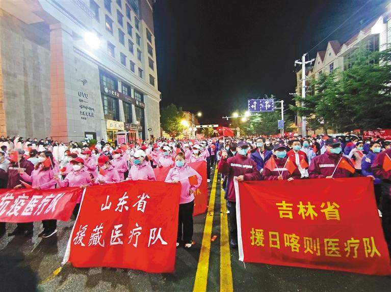 血脈相連、共克時艱。在日喀則市抗擊新冠肺炎疫情的緊要關(guan) 頭,山東(dong) 省委、省政府和吉林省委、省政府第一時間組織支援抗疫醫療隊,馳援日喀則。全體(ti) 醫療隊隊員響應組織號召,主動請纓、逆行出征,帶著山東(dong) 、吉林人民的深情厚誼,以生命守護生命、以大愛砥礪仁心,苦戰鏖戰40多個(ge) 日日夜夜,為(wei) 日喀則奪取抗擊新冠肺炎疫情全麵勝利作出了突出貢獻。