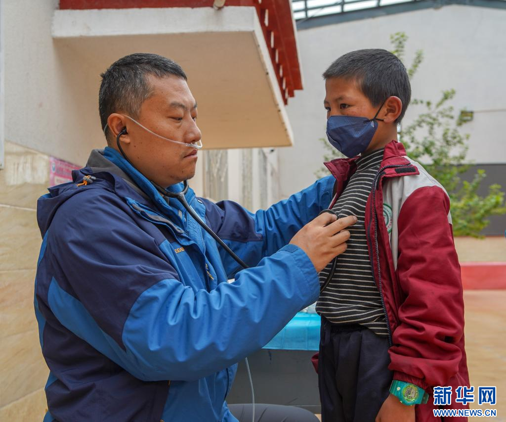7月4日,耿直醫生在給那曲市色尼區尼瑪鄉(xiang) 小學學生做心髒聽診。(新華社記者 邵澤東(dong) 攝)